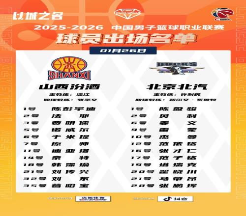 体育播报1月26日宣 今晚19:35,山西主场迎战北京,赛前大名单出炉。