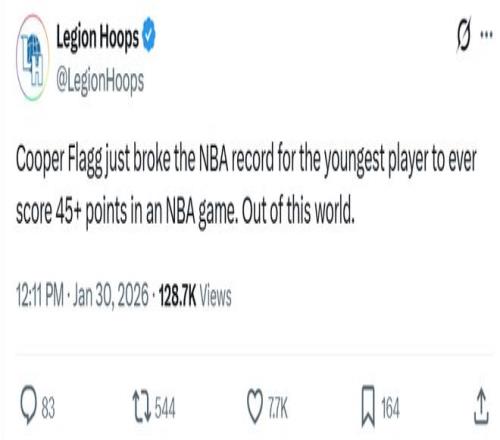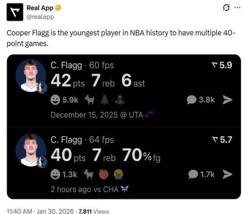 第七项:19岁40天的弗拉格成为史上单场得分45+最年轻的球员。